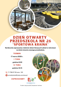 Serdecznie zapraszamy Rodziców dzieci biorących udział w rekrutacji do Przedszkola nr 26 „Sportowa Kraina” na Dni Otwarte naszej placówki.